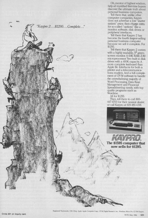 The Kaypro is one of the earliest portable computers. The first model was called the "II" in order to appear one-up on it's biggest competitor, the Osborne-1. Some call the Kaypro an "Osborne Clone", however it did improve on the design substantially, the most notable being the 9" display (.vs. 5" on the Osborne).