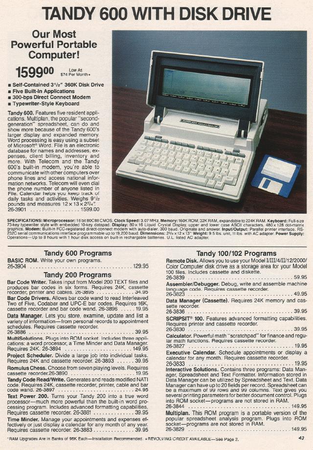 I used my Model 100 mainly as a text editor, which allowed me to work on source files when I was away from my office. Even though it was tiny by the days standards, it had a full sized keyboard and was actually quite easy to work on. The built in telecom program and RS-232 port allowed for easy transfer of text files back and forth to my main system. I occationally used the internal 300 bps modem to remotely access my other machines.